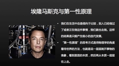 特斯拉的創(chuàng)始人埃隆·馬斯克。馬斯克在很多領(lǐng)域進(jìn)行了非常多顛覆性的創(chuàng)新,所以很多人問過馬斯克,你為什么能夠做這么多的創(chuàng)新?他的解釋是:“我是用第一性原理來思考這些問題的?!?br />