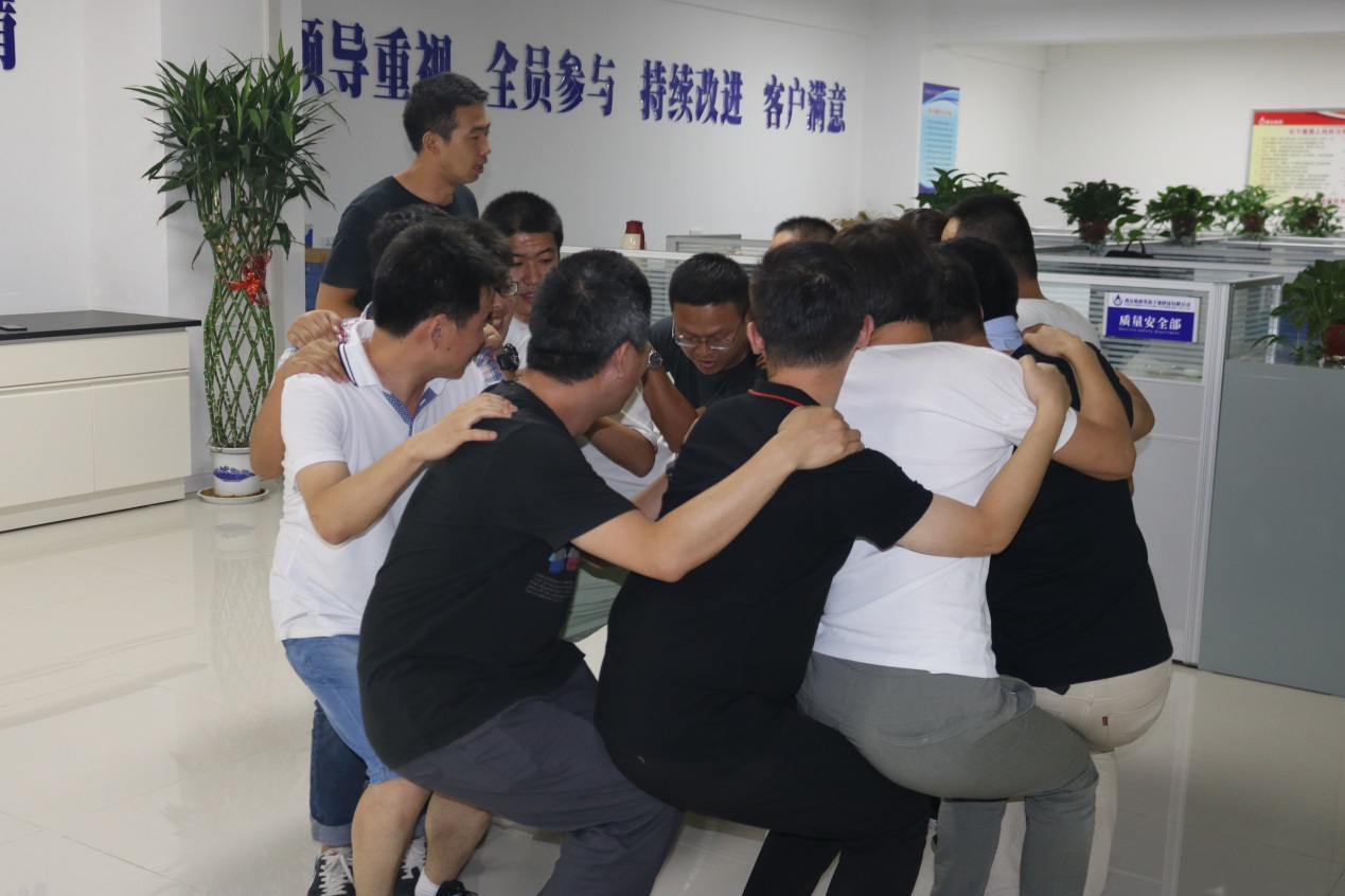 會議結(jié)束后,由綜合管理部郭榮組織全體員工開展了名為“人椅”的團隊建設(shè)活動。分別以奇數(shù)和偶數(shù)組成兩個比賽組,最后看哪個組堅持的時間更長則獲勝,并發(fā)有小禮物作為鼓勵?;顒悠陂g,大家都你爭我搶的談?wù)撟约旱挠^點,也在不斷的嘗試,可慢慢的這種聲音少了,更多的是練習,總結(jié)經(jīng)驗,學(xué)習別的戰(zhàn)隊的方式,女同志也積極響應(yīng)游戲規(guī)則,在這里,沒有男女,沒有上下級,只有戰(zhàn)友,只有兄弟!
